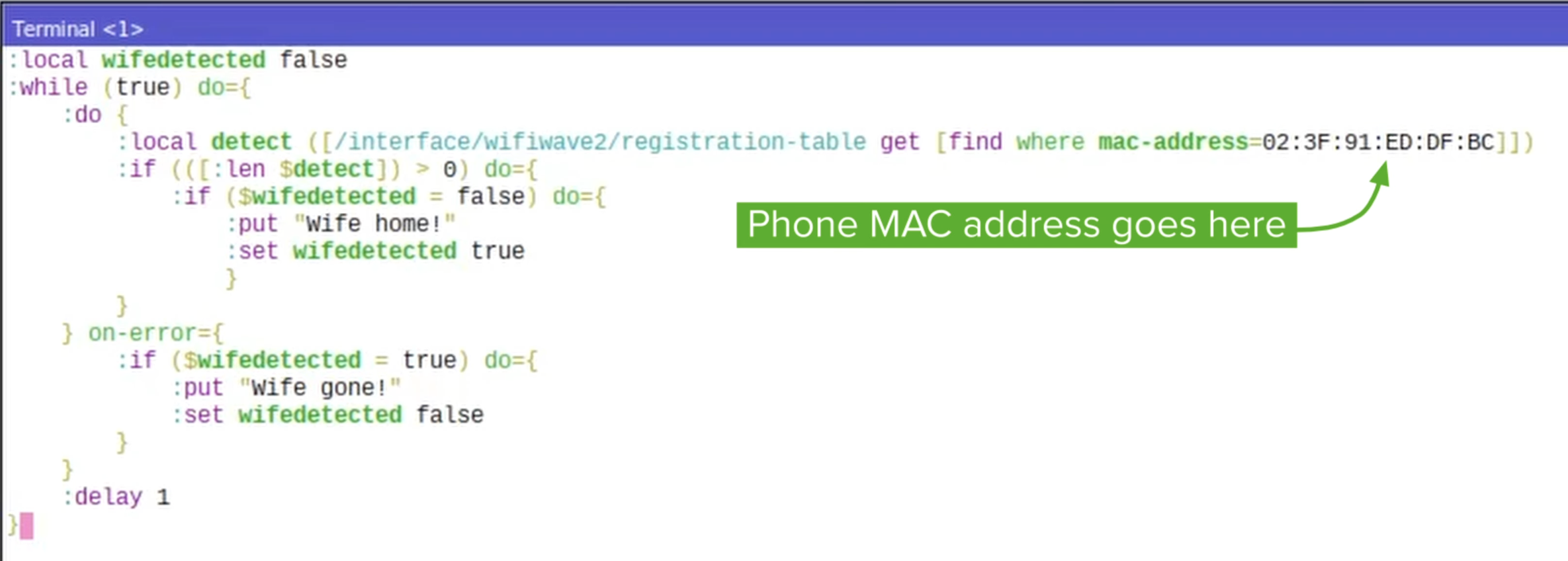 MikroTik 官方整的活,使用计划任务轮询 Wi-Fi 接口的 registeration-table,如果发现妻子手机的 MAC 地址出现,就通过 Telegram Bot API 发送消息。